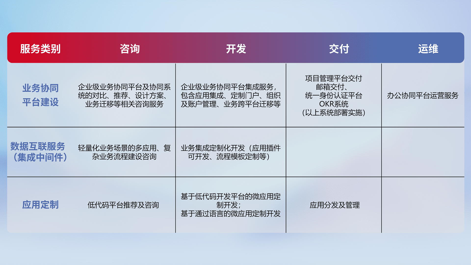 针对钉钉、、企微、、、、IDaas等平台级产品提供产品的规划、、方案、、、、交付、、定制化开发等服务,,,实现如统一协同办公、、、智能客户服务、、混合会议管理、、智能数据查询、、等业务场景,,实现数字化转型。。。