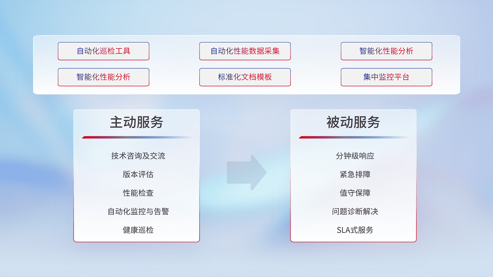智能化工具和标准化文档,,保障服务质量,,提供主动服务(包含技术咨询、、、、版本评估、、、性能检查、、自动化监控与告警、、、健康巡检)和被动服务包含(分钟级响应、、、紧急排障、、、、值守保障、、问题诊断解决、、、、SLA服务)。。。。
